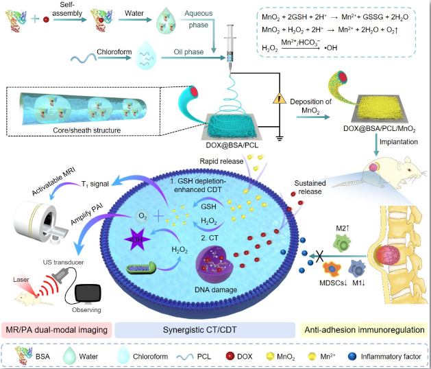 一种具有化学/化学动力学协同治疗、术后抗粘连和双模态成像功能的三层静电纺丝纳米纤维膜(DOX@BSA/PCL/MnO2),用于有效的脊髓肿瘤治疗。