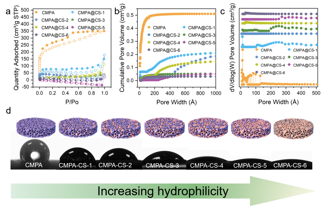 图2 CMPA-CS的孔道孔隙及润湿性能测试