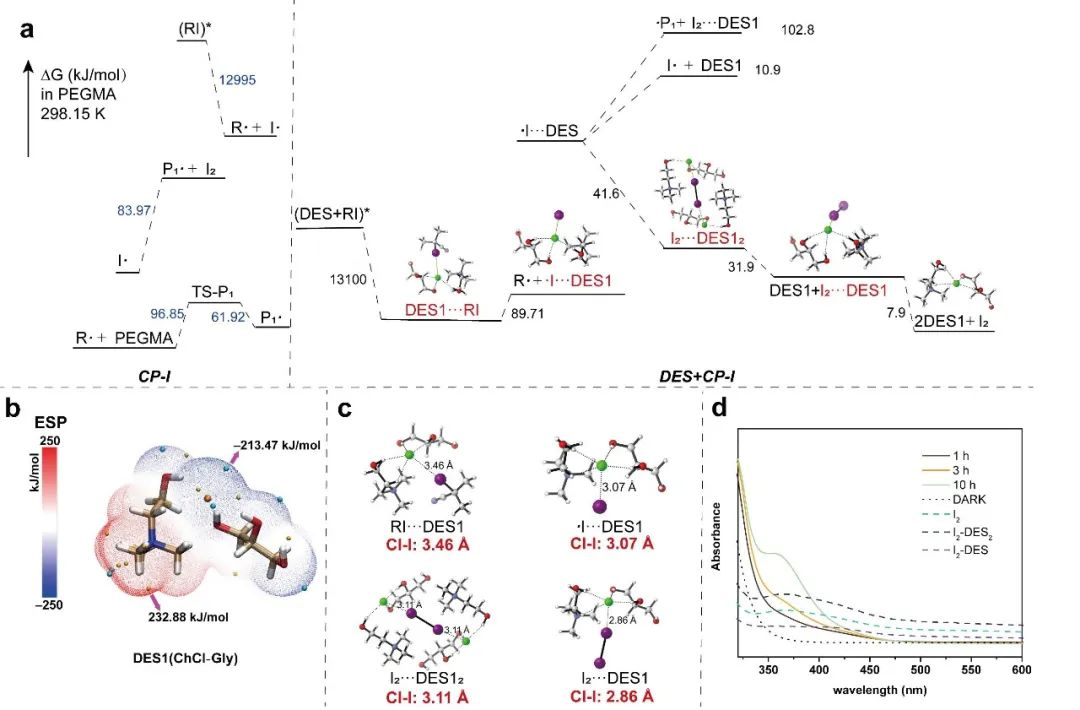 (a) DES(ChCl-Gly)中RCMP反应的自由能谱。(b)用Multiwfn生成的ChCl-Gly静电势(ESP)的彩色映射等值线图。(c)顺利获得DFT计算优化配合物的结构。(d)聚合体系的ChCl-Gly紫外-可见光吸收光谱