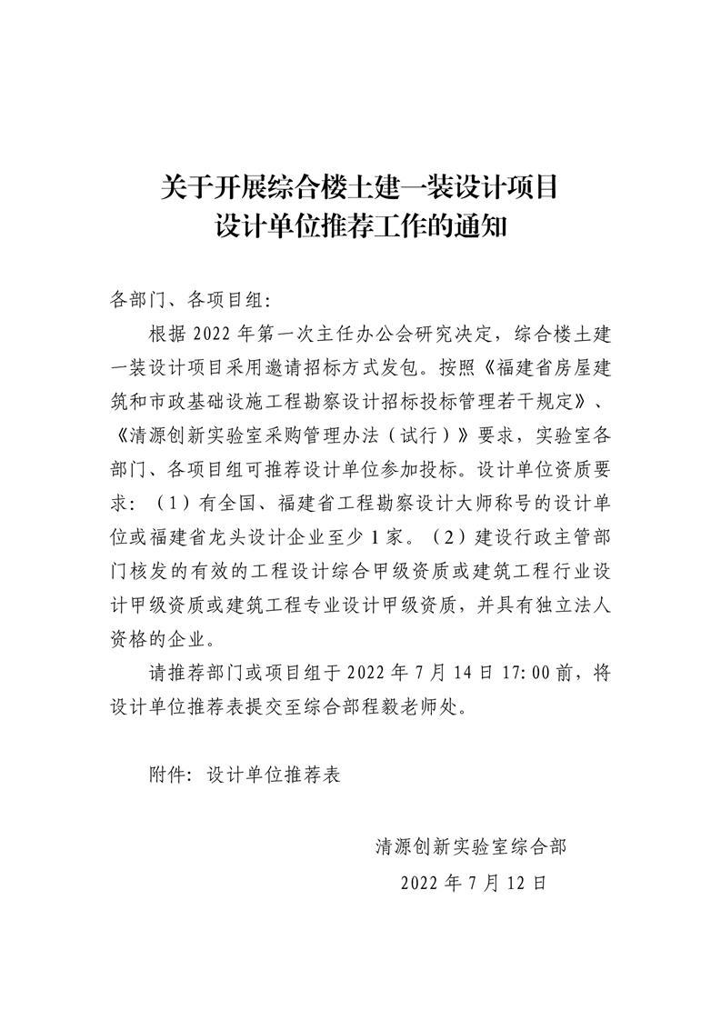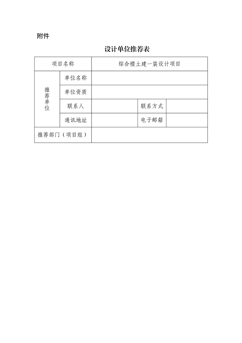 【综合部】关于召开综合楼土建一装设计项目设计单位推荐工作的通知