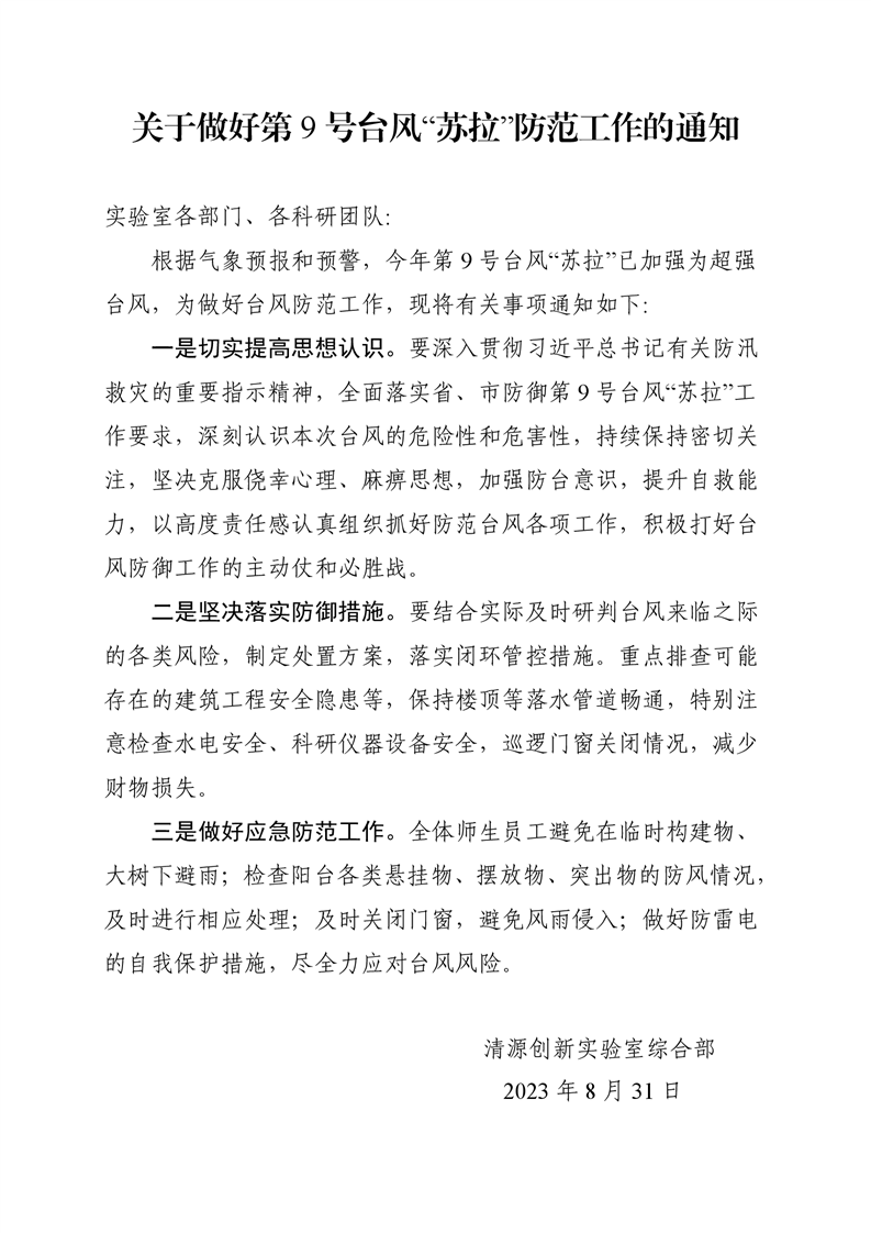 【综合部】关于实行第9号台风“苏拉”防范工作的通知