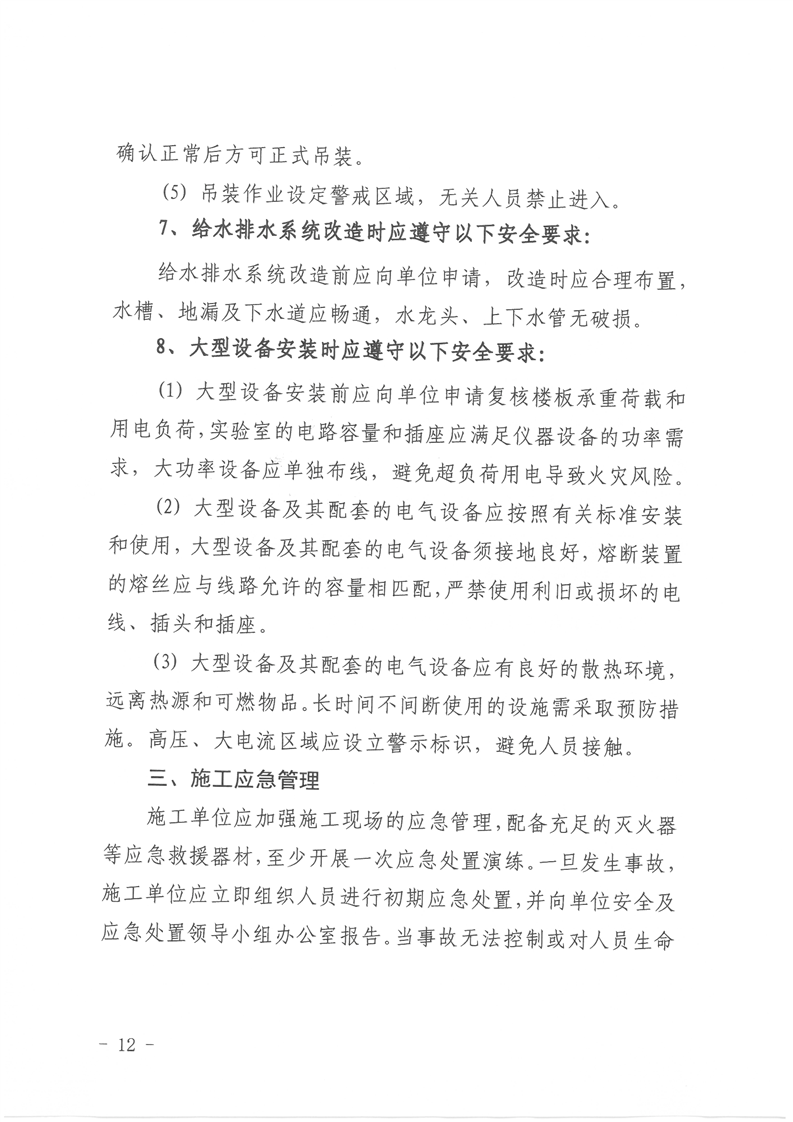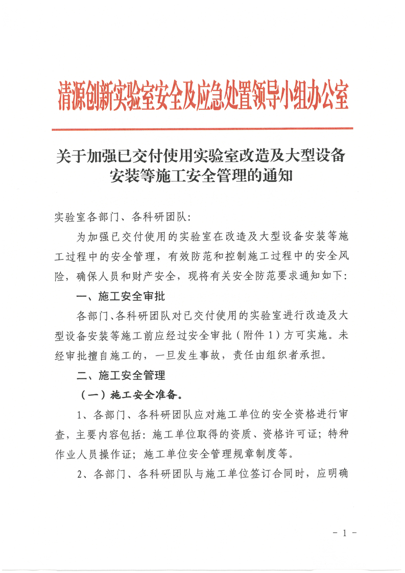 【安全及应急处置领导小组办公室】关于加强已交付使用实验室改造及大型设备安装等施工安全管理的通知