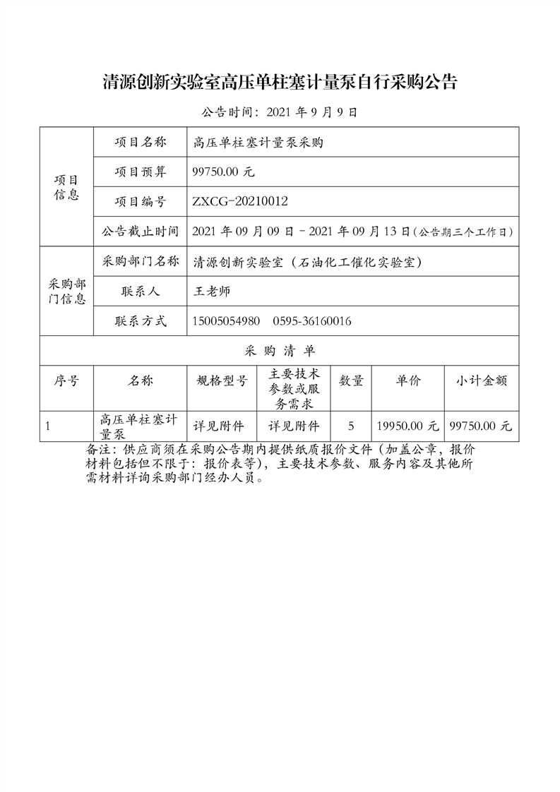 清源创新实验高压单柱塞计量泵自行采购公告