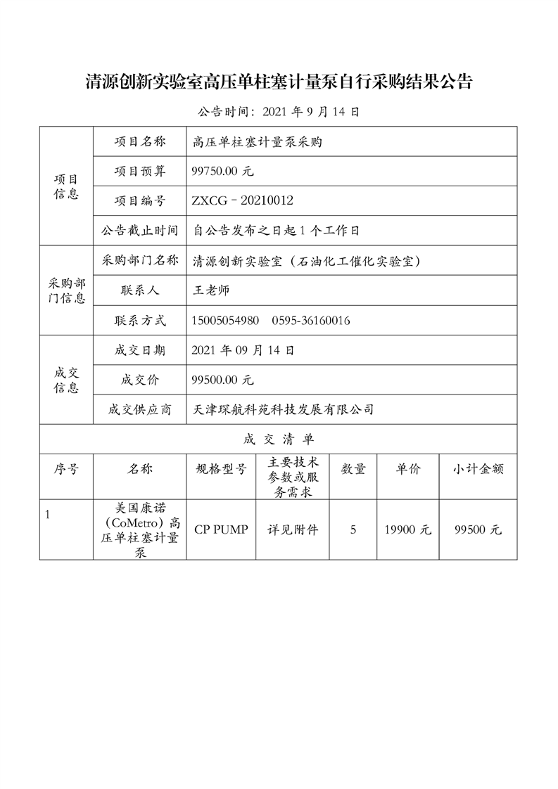 清源创新实验高压单柱塞计量泵自行采购结果公告