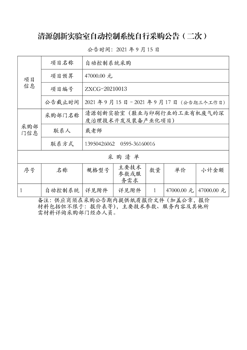 新得利(中国)自动控制系统自行采购公告(二次)