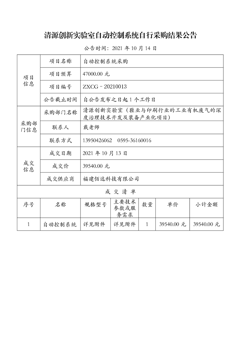 新得利(中国)自动控制系统自行采购结果公告