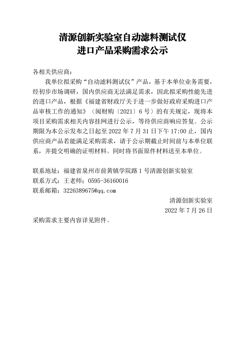 新得利(中国)自动滤料测试仪进口产品采购需求公示