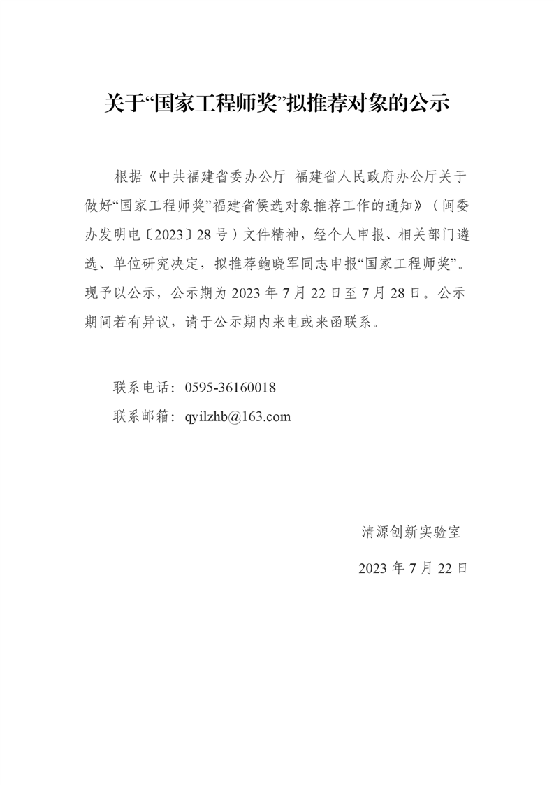 关于“国家工程师奖”拟推荐对象的公示