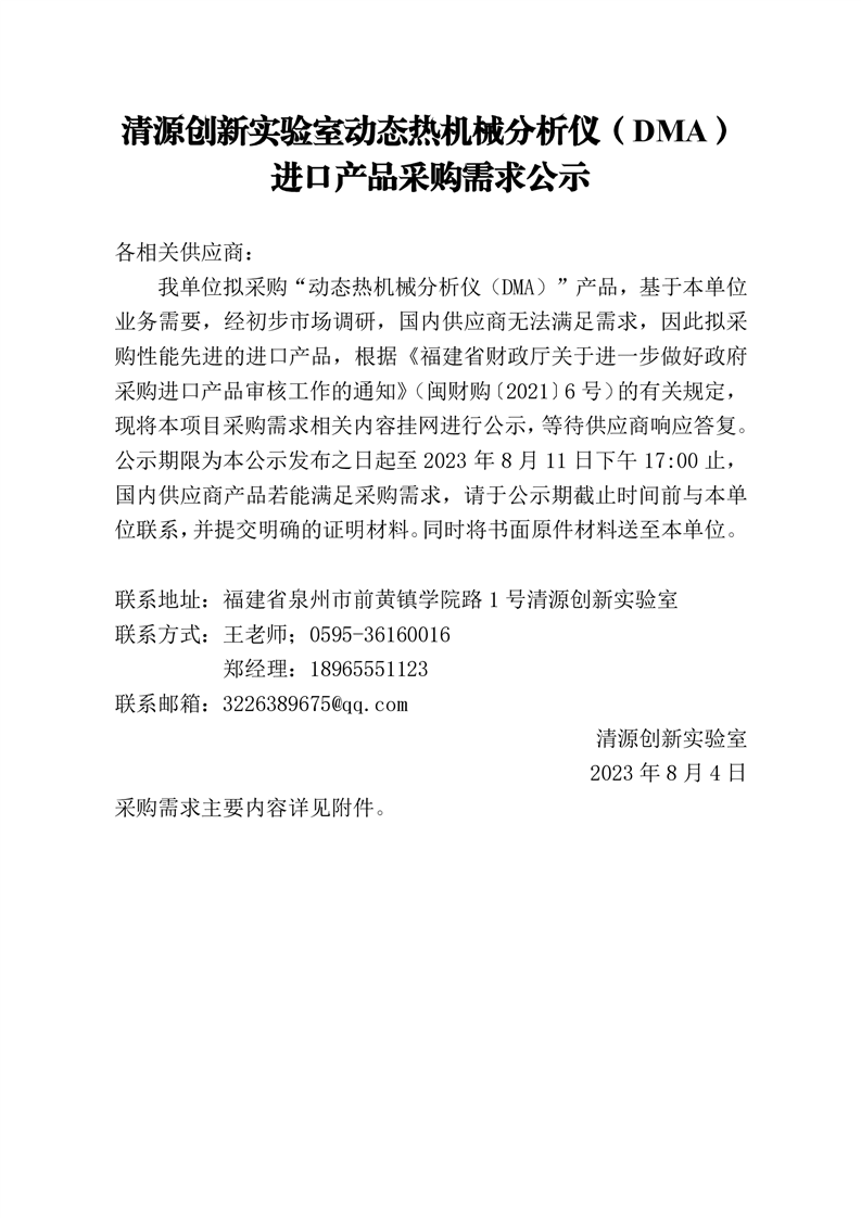 动态热机械分析仪(DMA)进口产品采购需求公示