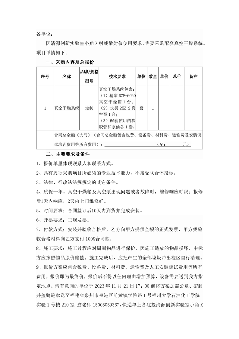 新得利(中国)小角X射线散射仪配套真空干燥系统采购询价通知