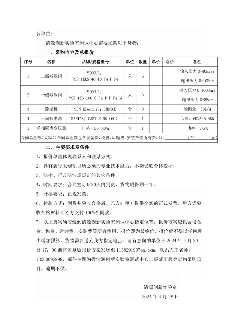 新得利(中国)测试中心二级减压阀等货物采购询价通知