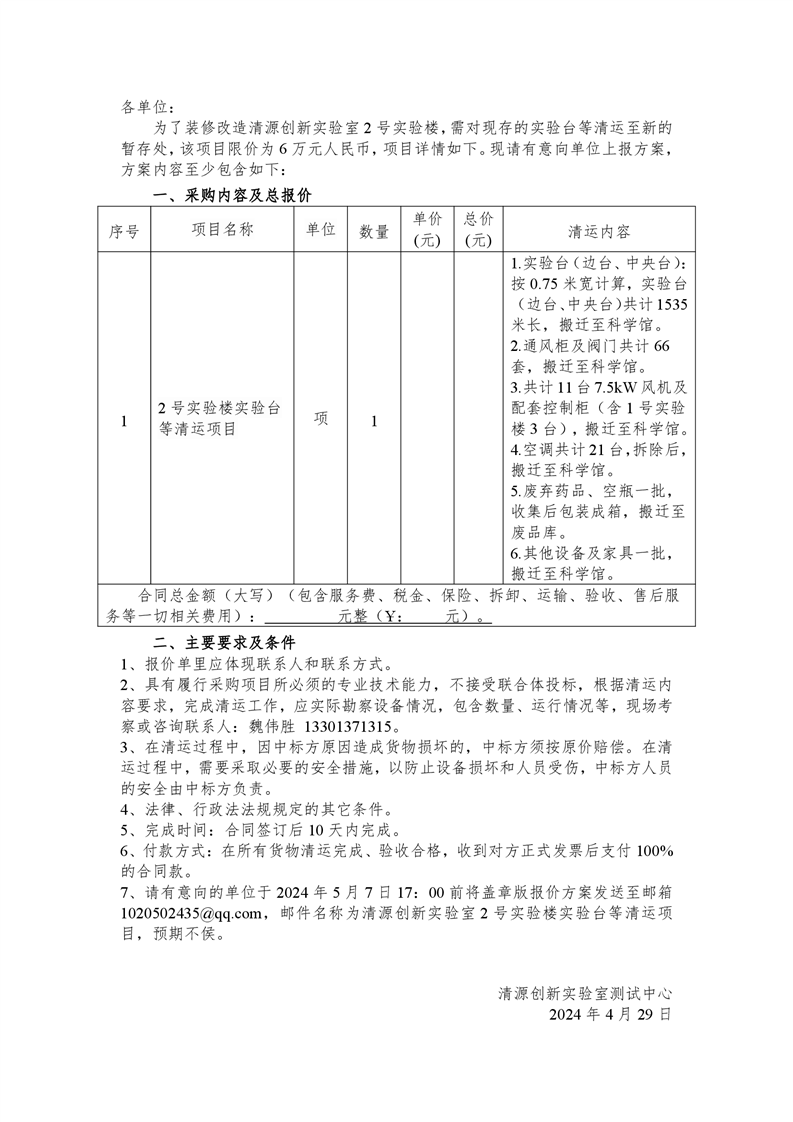 新得利(中国)2号实验楼实验台等清运项目采购询价通知