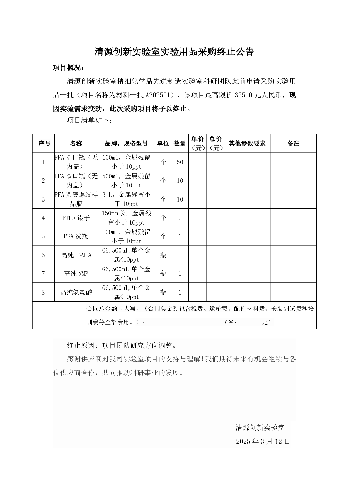 新得利(中国)实验用品采购终止公告