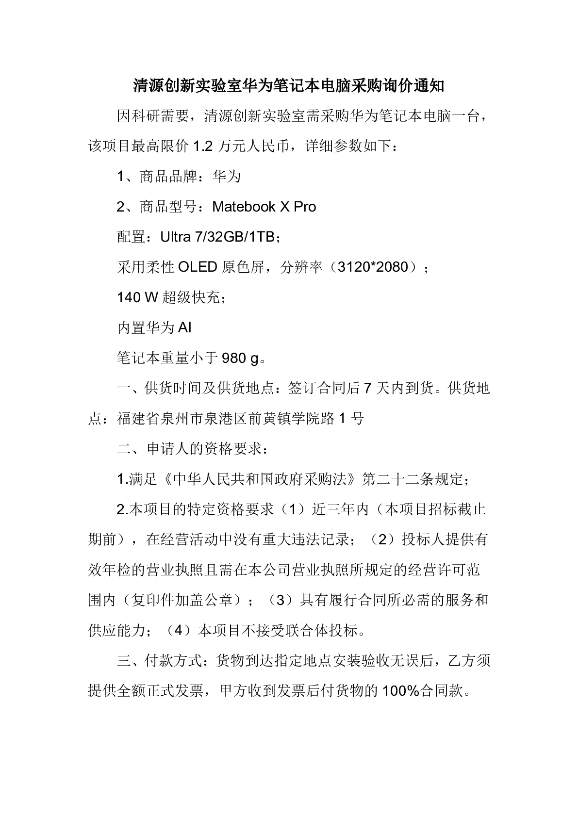 新得利(中国)华为笔记本电脑一台询价通知
