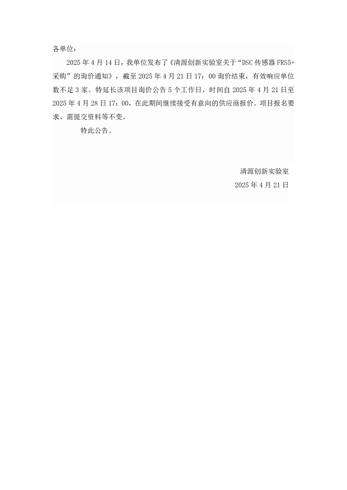 新得利(中国)DSC传感器FRS5+采购项目询价延期公告