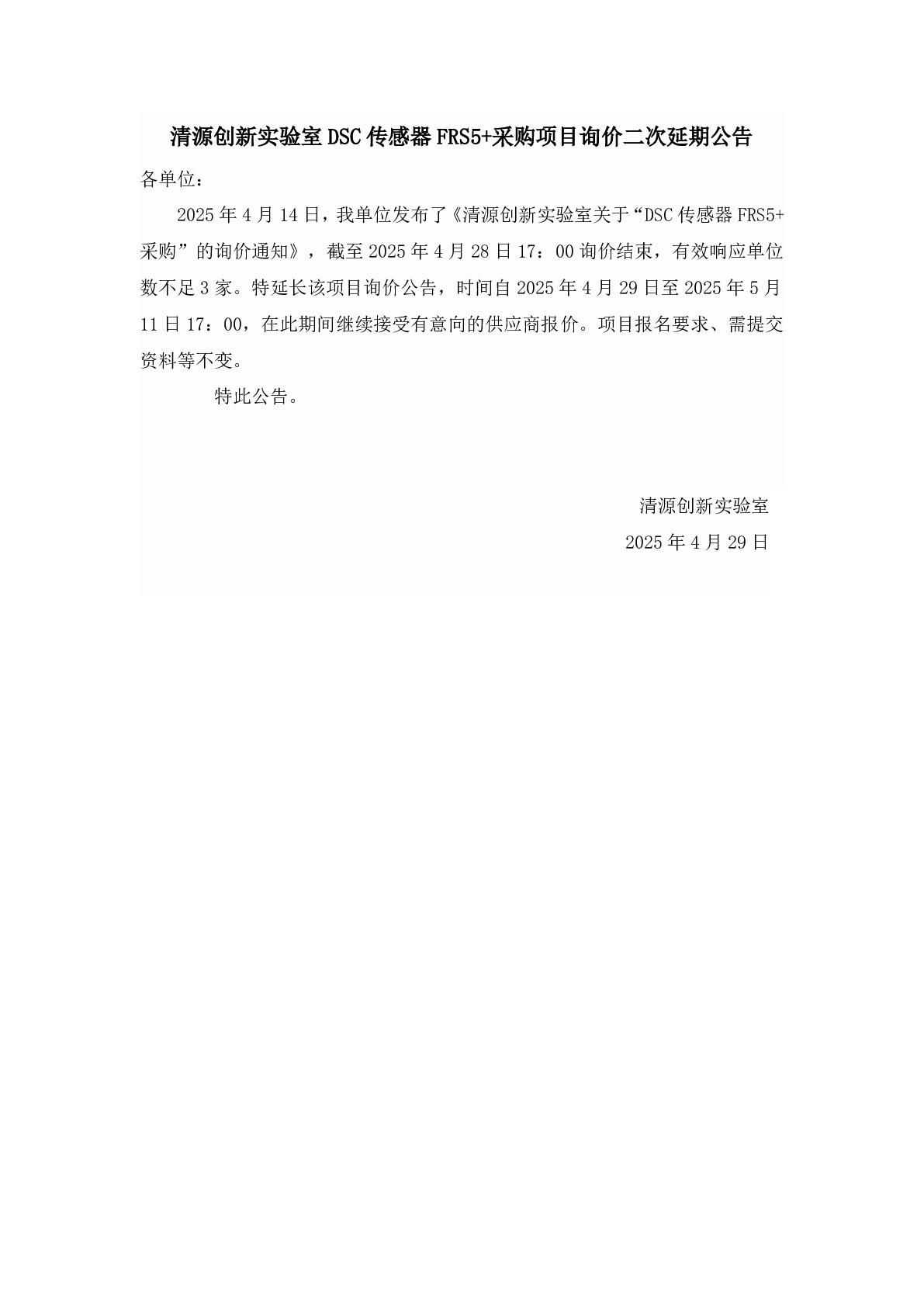 新得利(中国)DSC传感器FRS5+采购项目询价二次延期公告