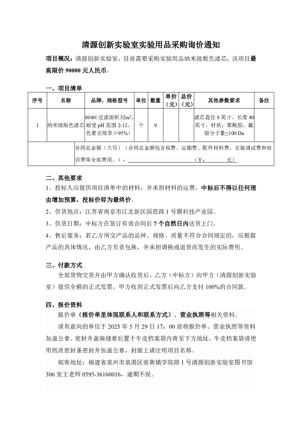 新得利(中国)纳米级脱色滤芯采购询价通知