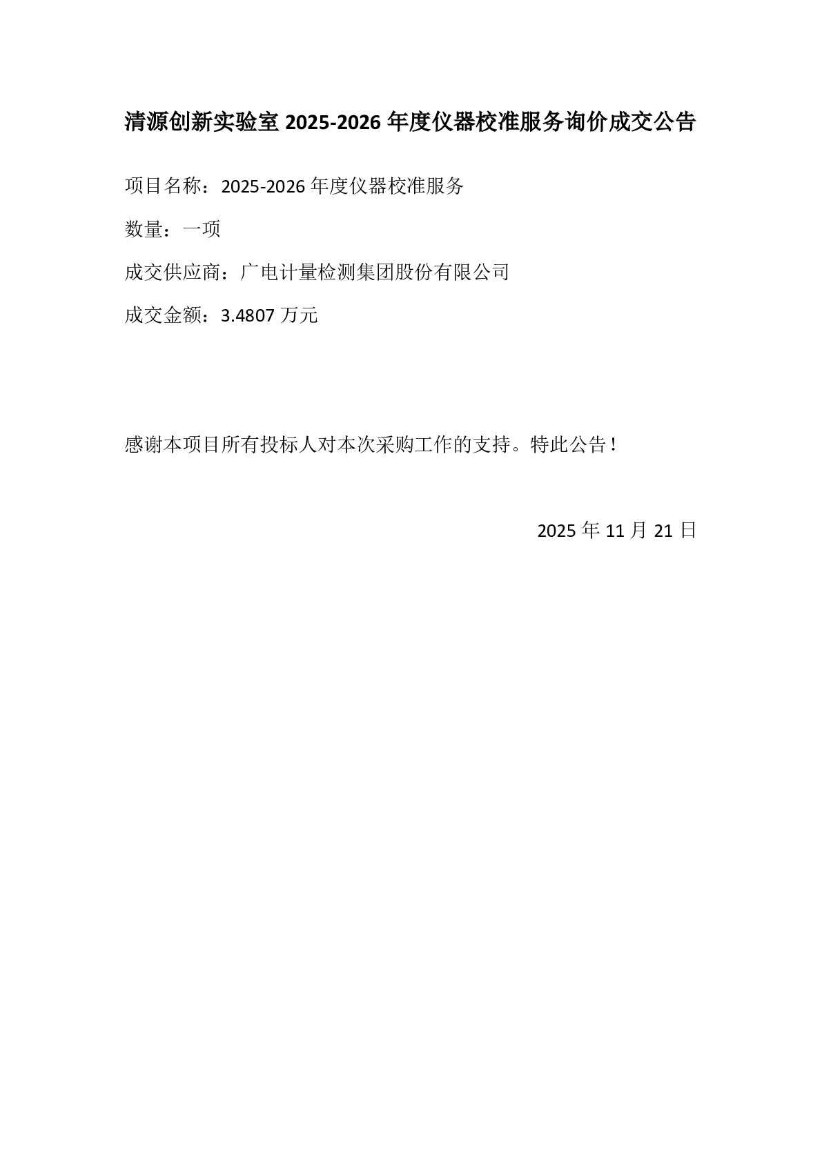 新得利(中国)关于采购2025-2026年度仪器校准服务询价采购成交公告