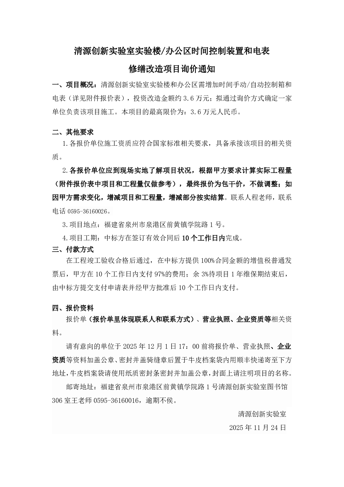 新得利(中国)实验楼办公区时间控制装置和电表修缮改造项目询价通知