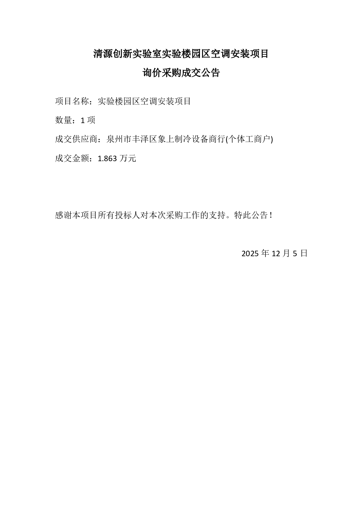 新得利(中国)实验楼园区空调安装项目询价采购成交公告