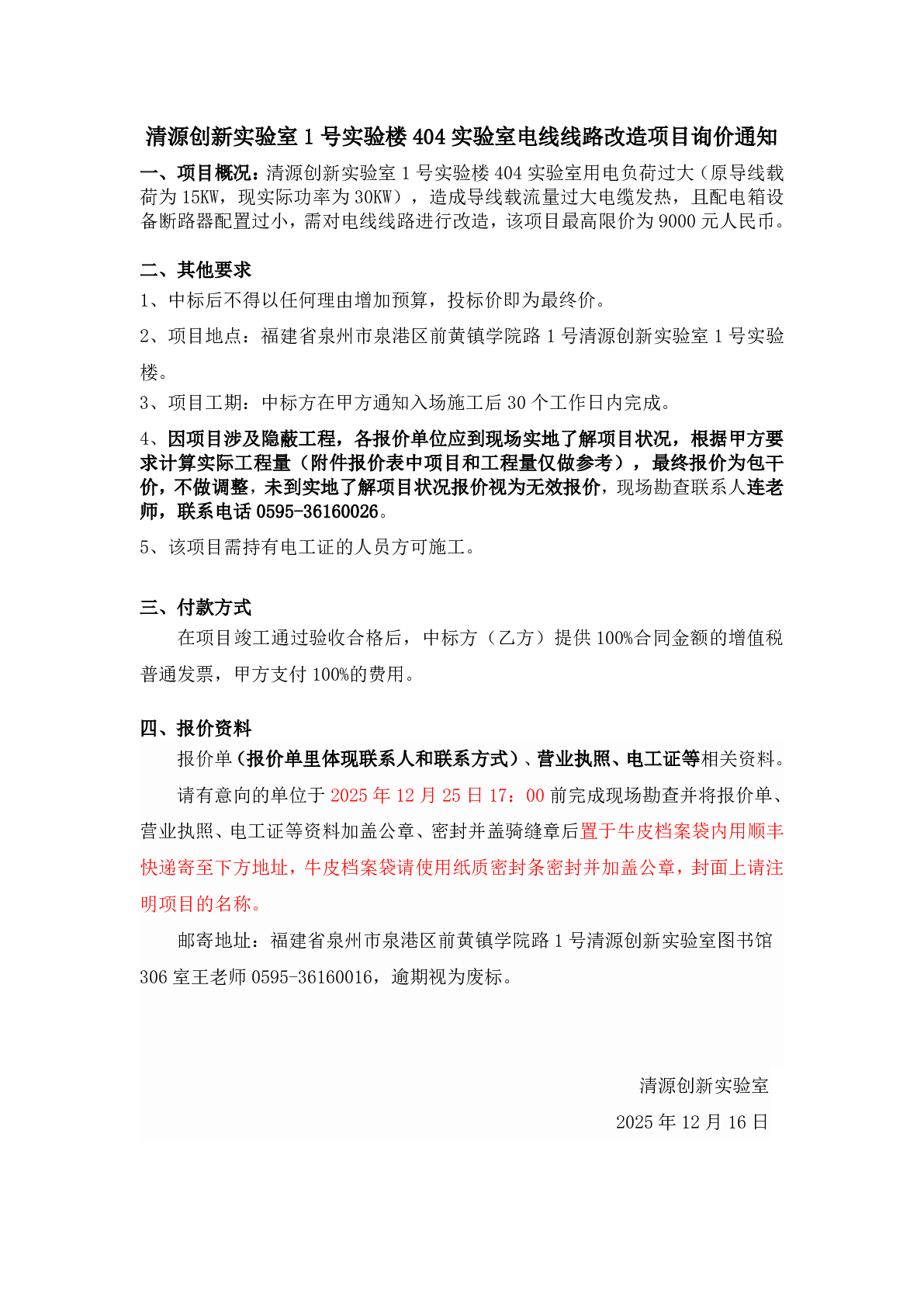 新得利(中国)1号实验楼电线线路改造项目询价通知