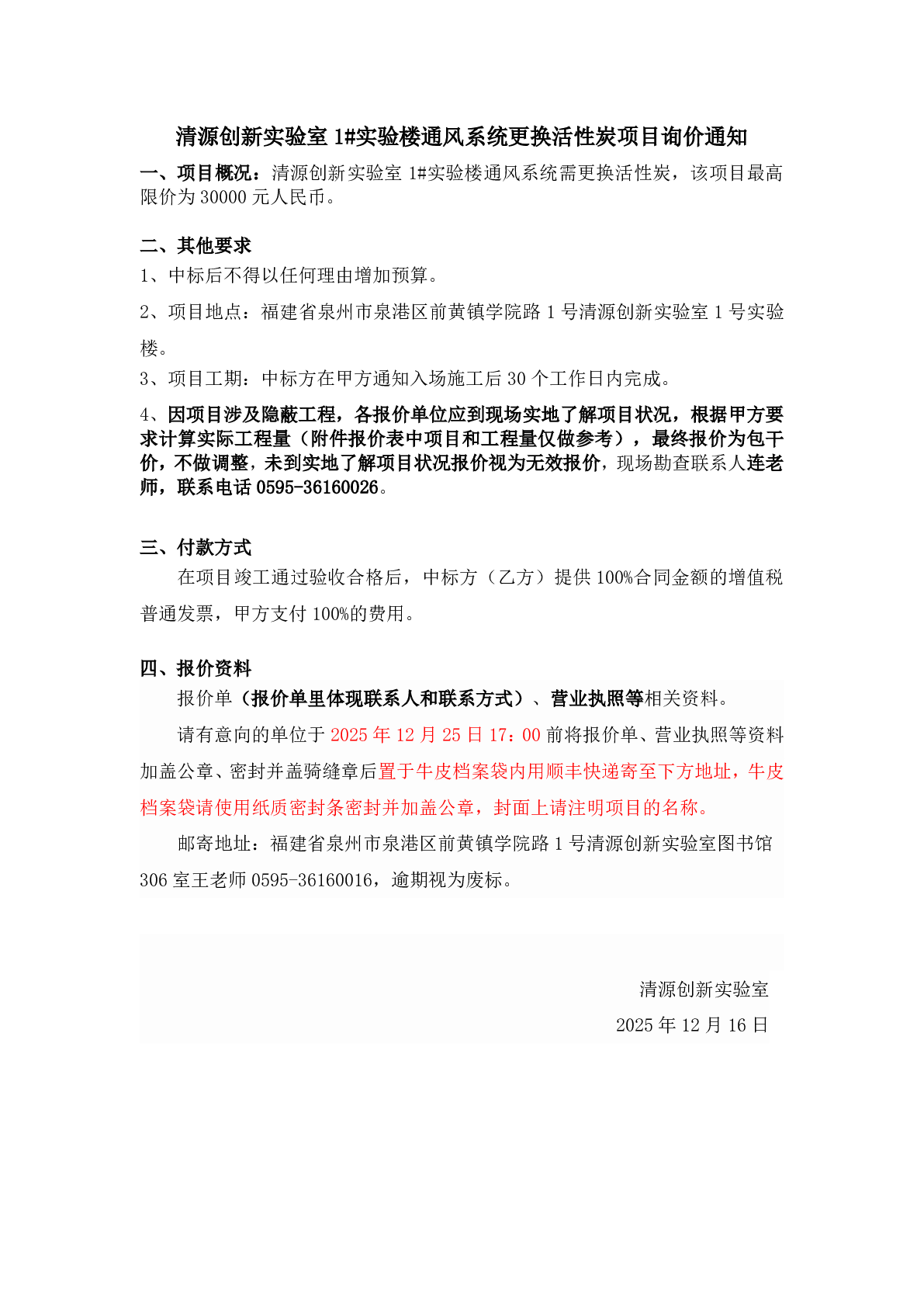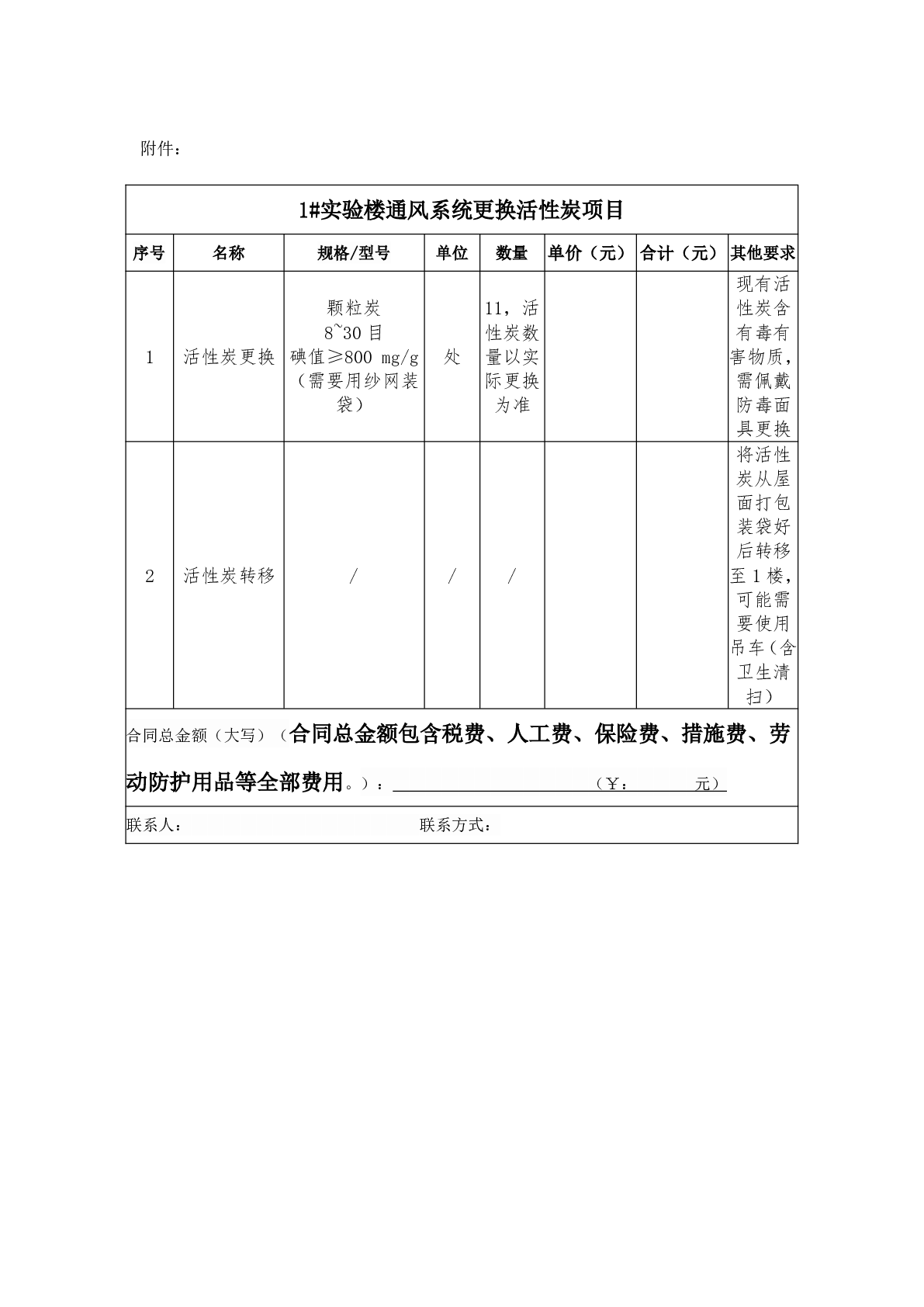 新得利(中国)1#实验楼通风系统更换活性炭项目询价通知