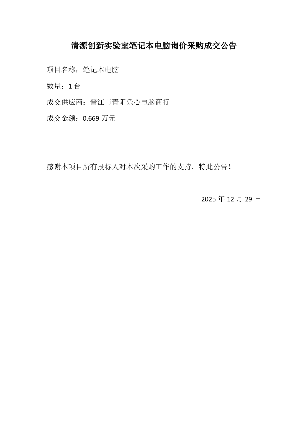 新得利(中国)笔记本电脑询价采购成交公告