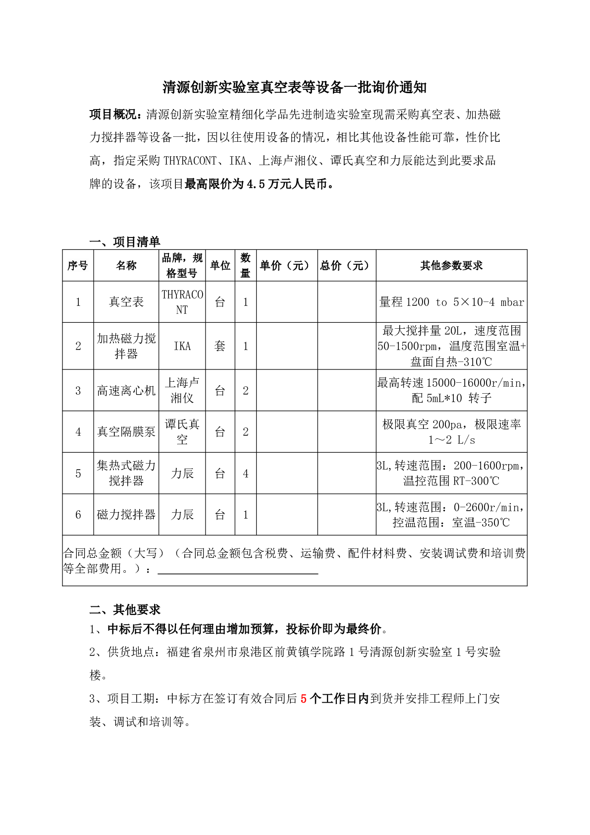 新得利(中国)真空表等设备一批询价通知